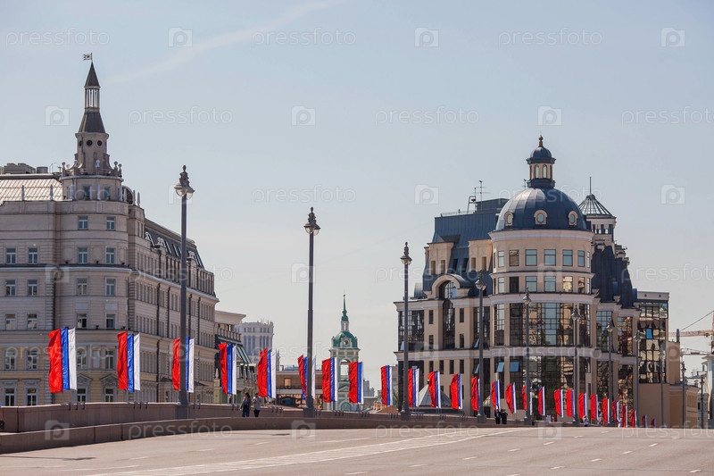 Большой Москворецкий мост украшен российским триколором к празднику Дня России 12 июня. Россия, Москва