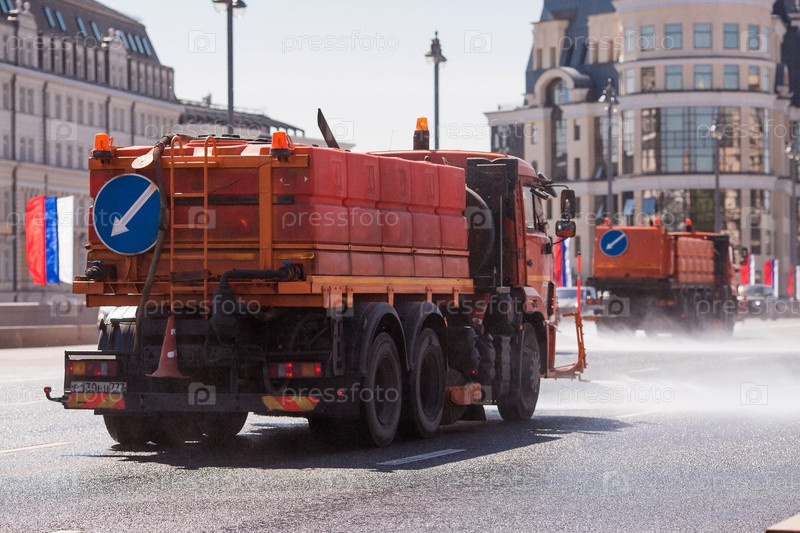 Специальное оборудование. По улице едет поливочная машина. Уборка города летом. Москва, Большой Москворецкий мост. Центр города