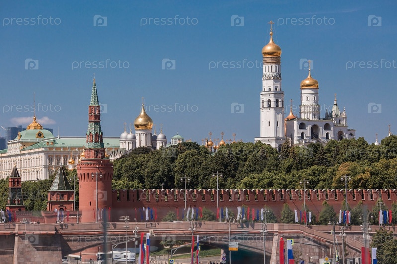 Москва, Россия, июнь 2023 г.: Вид на колокольню Ивана Великого, стены Кремля и Большой Москворецкий мост в солнечный летний день