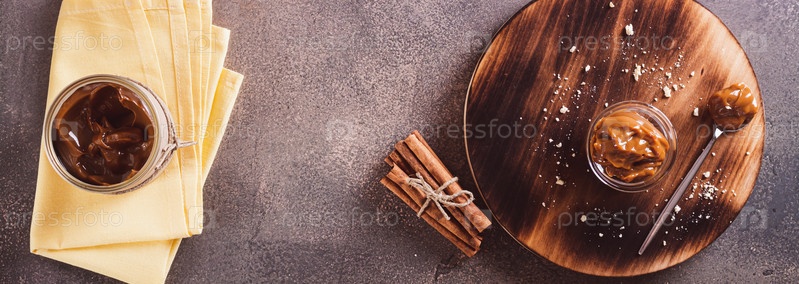Вареное сгущенное молоко в стеклянной миске и банка на столе, вид на веб-баннер