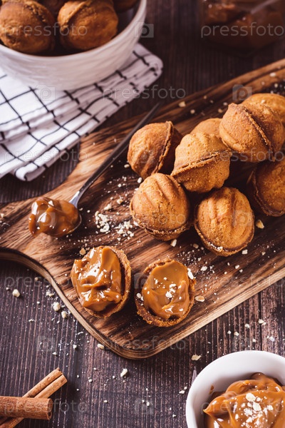 Свежее печенье в форме ореха, наполненное вареным сгущенным молоком, на доске, вертикальный вид