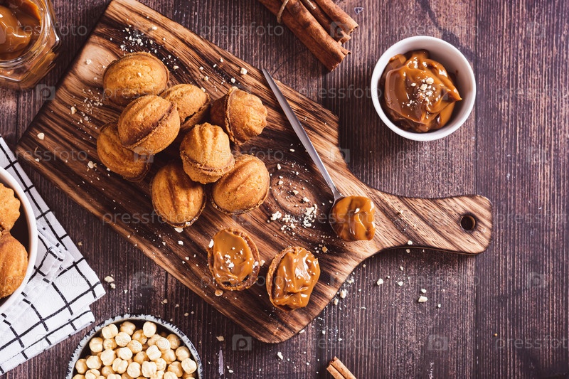 Домашнее печенье в форме грецкого ореха с начинкой из вареного сгущенного молока на доске, вид сверху