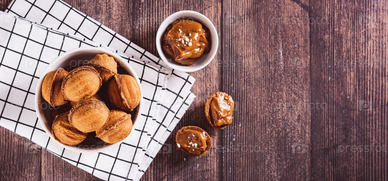 Миска с печеньем и орехами, наполненная вареным сгущенным молоком, на доске, вид сверху, веб-баннер