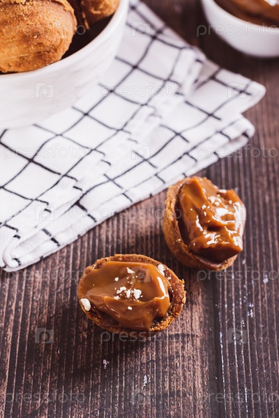 Половинки орехового печенья, наполненные сладким вареным сгущенным молоком на столе крупным планом, вертикальный вид