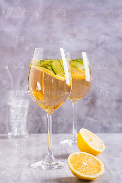 Летний коктейль Hugo spritz с шампанским, огурцами, лимоном и мятой в вертикальных бокалах