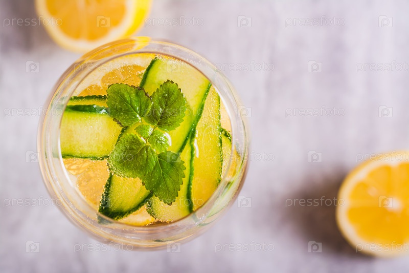 Большой план летнего коктейля Hugo spritz с шампанским, огурцами, лимоном и мятой в стеклянной форме сверху