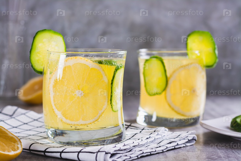 Освежающий лимонад с лимоном, огурцом и льдом в стаканах на столе
