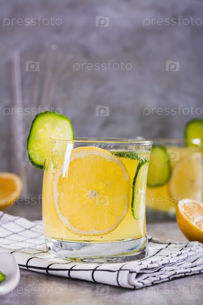 Освежающий лимонад с лимоном, огурцом и льдом в стаканах на вертикальном столе