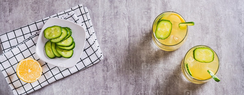 Детокс летний лимонад с лимоном и огурцом в стаканах на веб-баннере с видом на стол
