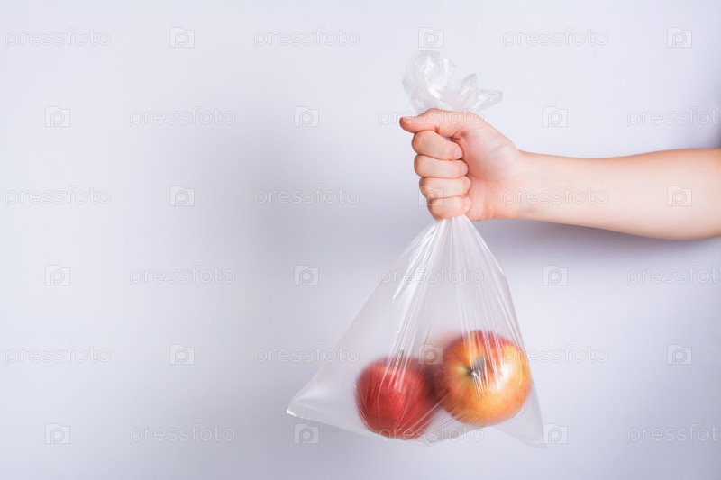 Рука держит одноразовый прозрачный пакет с яблоками