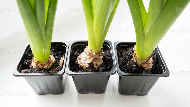 Ростки гиацинта в маленьких цветочных горшках