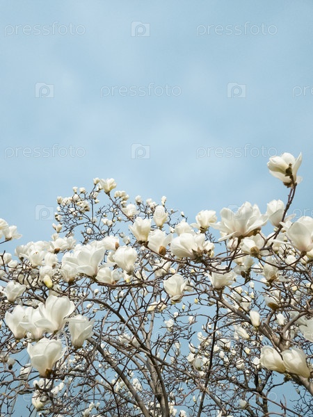 Красивые цветы белой магнолии кобус на фоне голубого неба, избирательный фокус