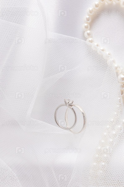 Вертикальный вид двух шикарных бриллиантовых обручальных колец свадебной белой вуали невесты и жемчужных бусин. открытка, обложка, приглашение
