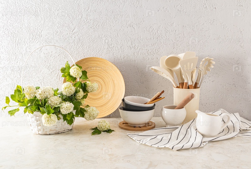 Красивый интерьер кухонной столешницы с различной кухонной утварью и декором в светлых тонах. экологически чистая кухня. Эко предметы