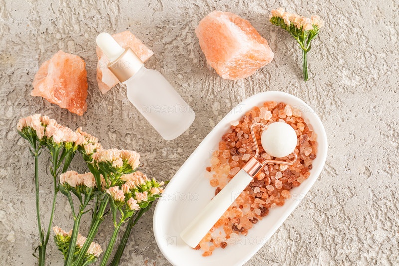 Роликовый круглый массажер из белого камня лежит на соли для ванн на сером цементном фоне с бутылкой косметического масла. самостоятельное лечение