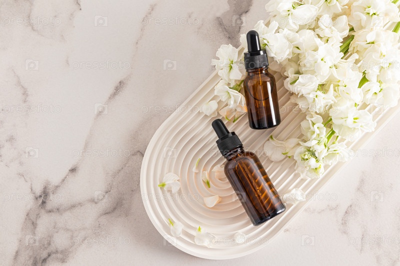 Две косметические бутылки с косметическим продуктом для личной гигиены лежат на белом гипсовом подносе в виде арки и цветов. Вид сверху