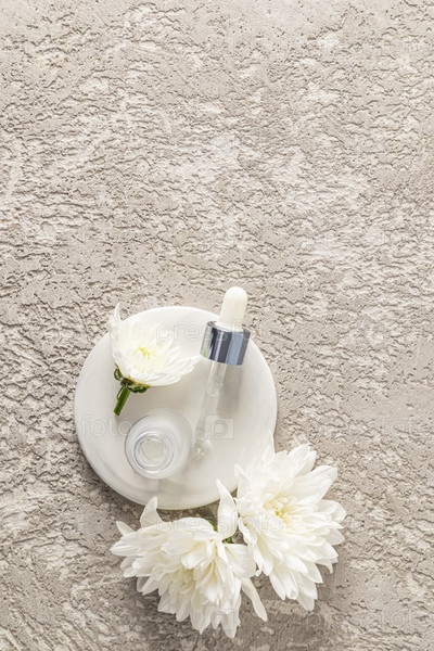 Вертикальный вид открытой матовой белой бутылки со средством для ухода за кожей лица и косметикой, наполненной пипеткой. Пространство для копирования. натуральная косметика