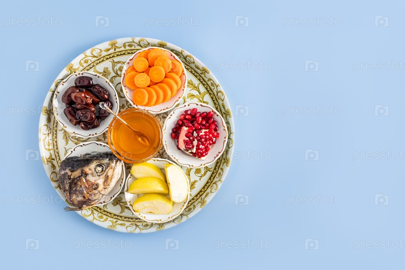 Тарелка с традиционной символикой Рошашана. мед, голова, финики, яблоки, гранаты, ломтики моркови. Вид сверху. Синий фон. Копия пространства