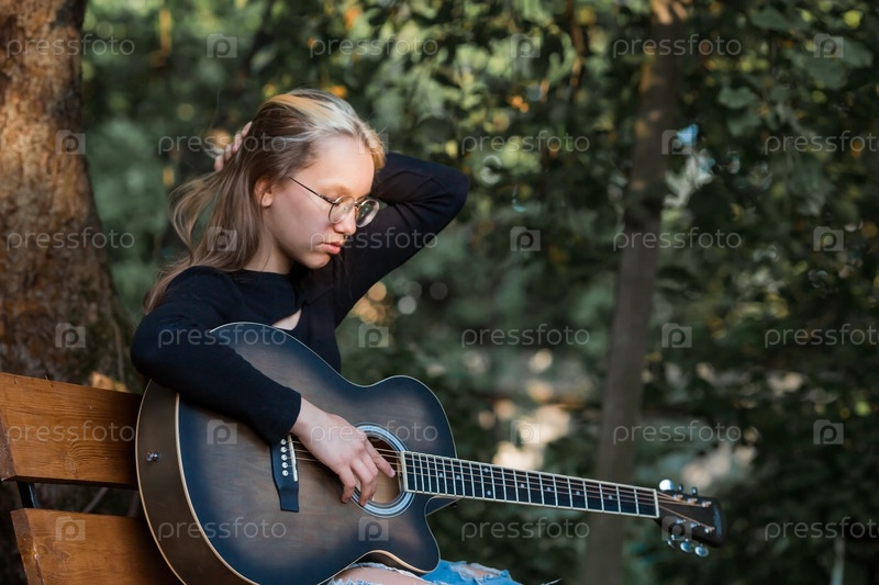 Музыка и хобби. Талантливая молодая девушка-музыкант сидит одна и сочиняет песни на гитаре. Девушка играет спокойную мелодию на музыкальном инструменте