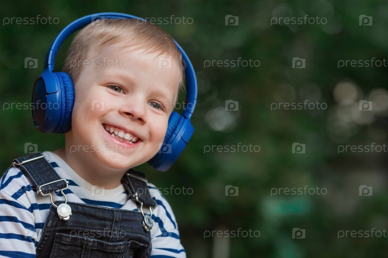Милый, веселый, маленький мальчик улыбается и слушает музыку в больших синих наушниках на природе в парке. Музыка для развития детей