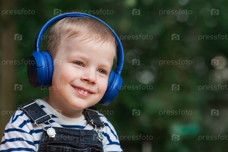 Милый, веселый, маленький мальчик улыбается и слушает музыку в больших синих наушниках на природе в парке. Музыка для развития детей