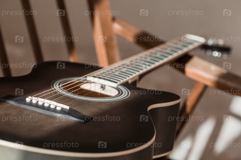 Гитара. Гитарные аккорды. Акустическая гитара. Музыка. Музыкальный фон. Изображение акустической гитары в комнате с ретро-креслом. Жесткий свет. Тени