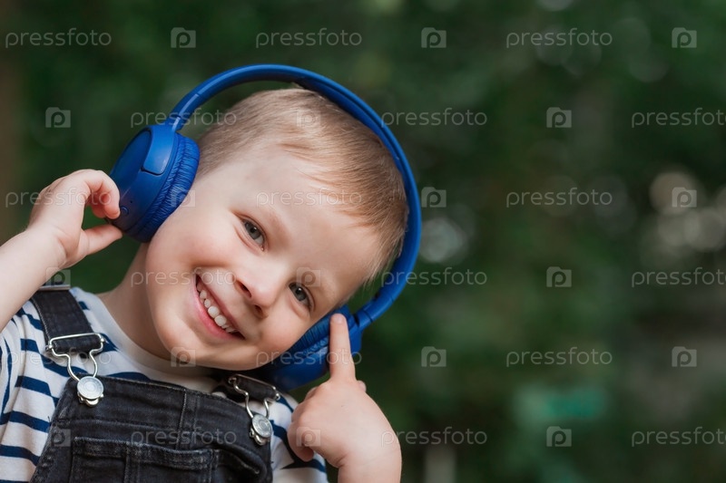 Милый, веселый, маленький мальчик улыбается и слушает музыку в больших синих наушниках на природе в парке. Музыка для развития детей