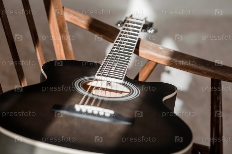Гитара. Гитарные аккорды. Акустическая гитара. Музыка. Музыкальный фон. Изображение акустической гитары в комнате с ретро-креслом. Жесткий свет. Тени