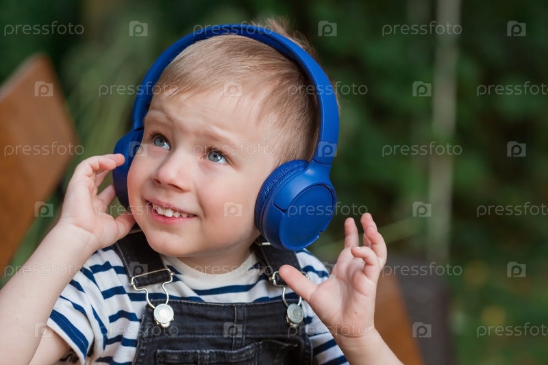 Милый, веселый, маленький мальчик улыбается и слушает музыку в больших синих наушниках на природе в парке. Музыка для развития детей