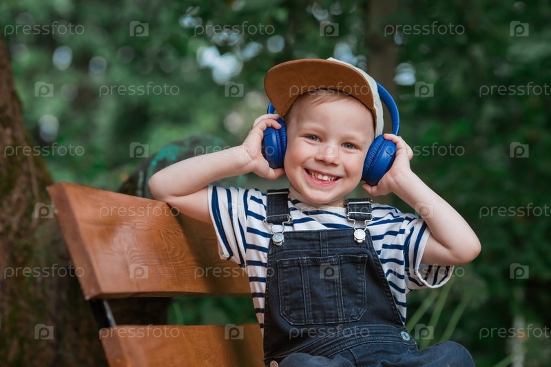 Милый, веселый, маленький мальчик улыбается и слушает музыку в больших синих наушниках на природе в парке. Музыка для развития детей
