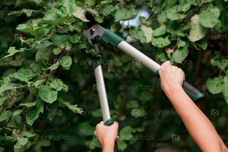 Садовнику отрезают руки специальными секаторами, плодовые деревья в саду. Уход за растениями, обрезка деревьев