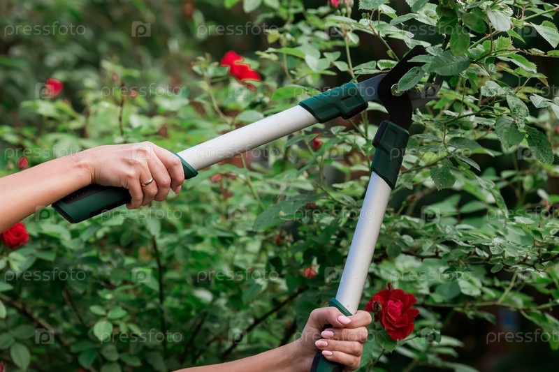 Руками садовника специальным секатором обрезают кустовые розы в саду. Уход за растениями, обрезка деревьев