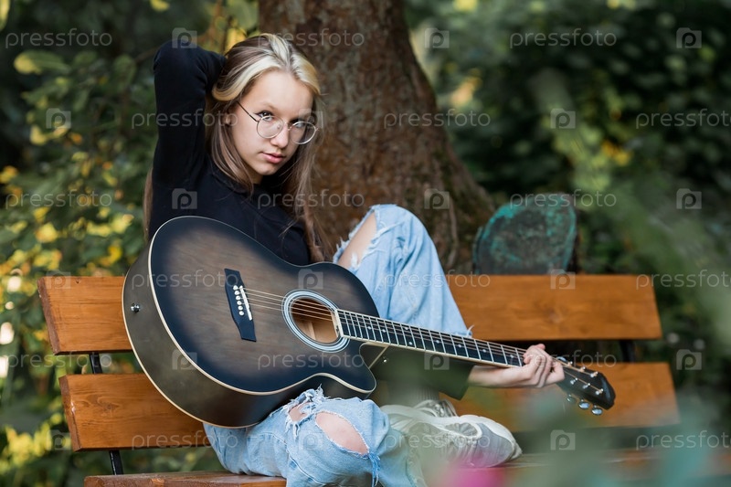 Музыка и хобби. Талантливая молодая девушка-музыкант сидит одна и сочиняет песни на гитаре. Девушка играет спокойную мелодию на музыкальном инструменте