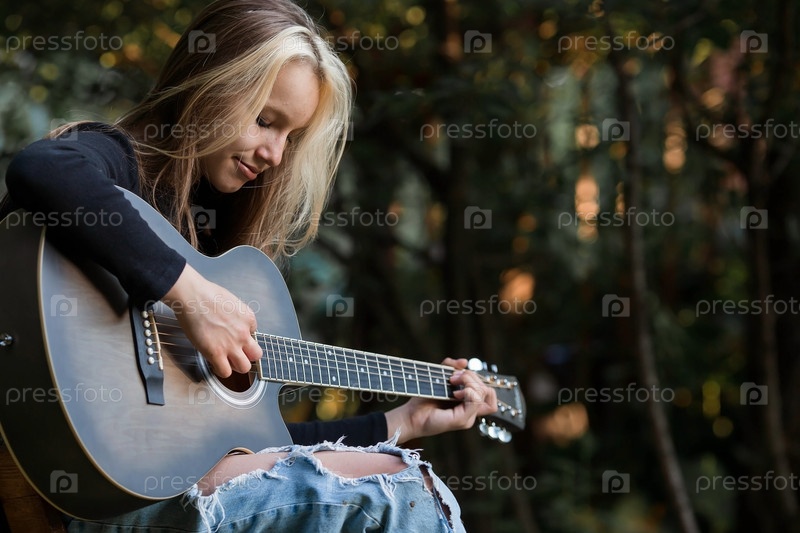 Музыка и хобби. Талантливая молодая девушка-музыкант сидит одна и сочиняет песни на гитаре. Девушка играет спокойную мелодию на музыкальном инструменте