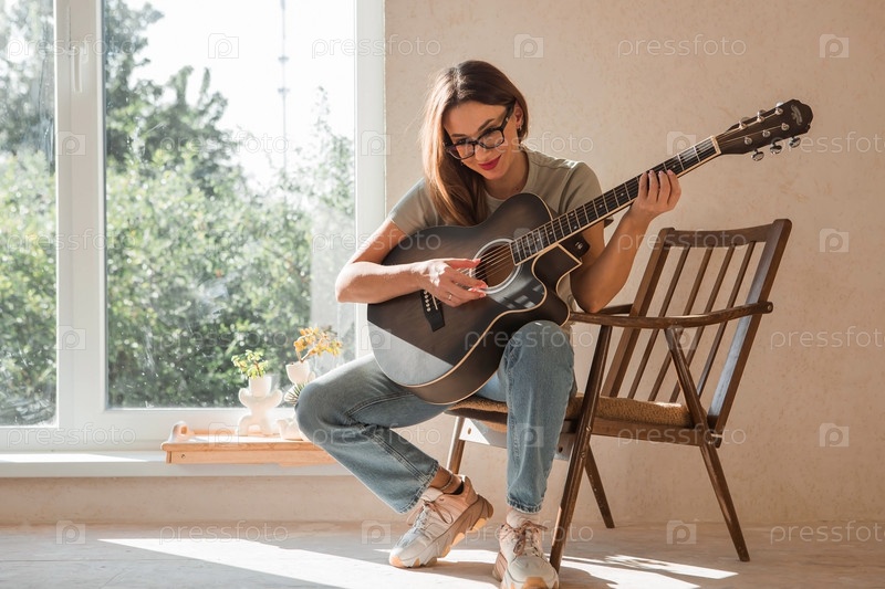 Музыка и хобби. Талантливая молодая женщина-музыкант сидит одна и сочиняет песни на гитаре. Дама играет спокойную мелодию на музыкальном инструменте