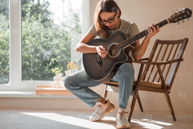 Музыка и хобби. Талантливая молодая женщина-музыкант сидит одна и сочиняет песни на гитаре. Дама играет спокойную мелодию на музыкальном инструменте