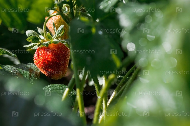 Баннер. Ягоды клубники на кусте. Клубника краснеет, созревает под лучами солнца. Макро. Домашняя клубника краснеет в саду. Кусты клубники в летнем саду