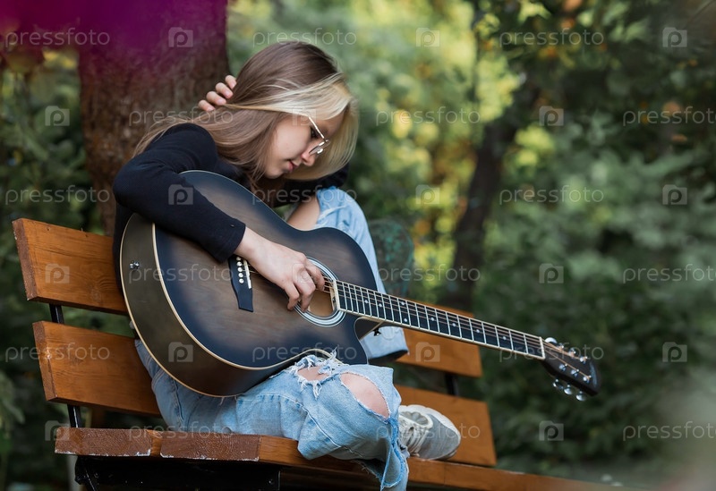 Музыка и хобби. Талантливая молодая девушка-музыкант сидит одна и сочиняет песни на гитаре. Девушка играет спокойную мелодию на музыкальном инструменте