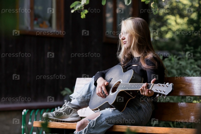 Музыка и хобби. Талантливая молодая девушка-музыкант сидит одна и сочиняет песни на гитаре. Девушка играет спокойную мелодию на музыкальном инструменте