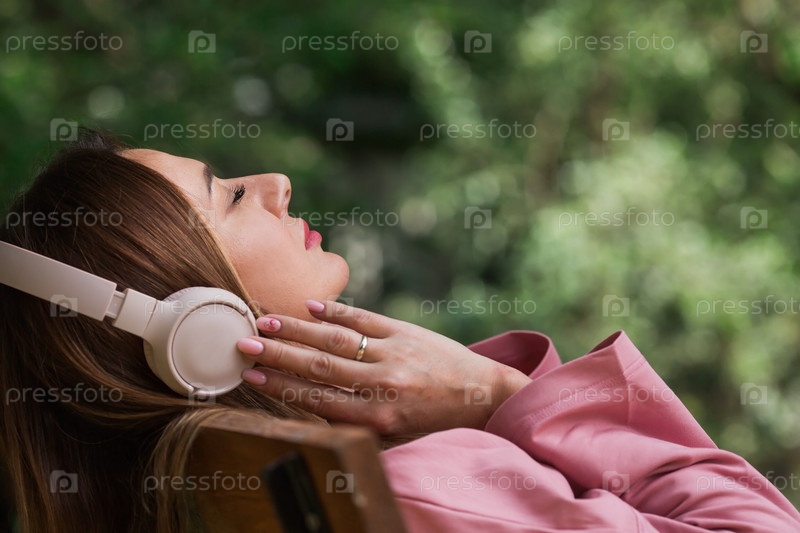 Молодая красивая женщина слушает музыку в наушниках с закрытыми глазами на скамейке в парке. Мир, гармония, расслабление и релаксация