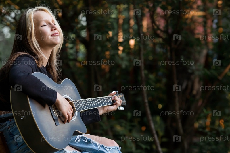 Музыка и хобби. Талантливая молодая девушка-музыкант сидит одна и сочиняет песни на гитаре. Девушка играет спокойную мелодию на музыкальном инструменте