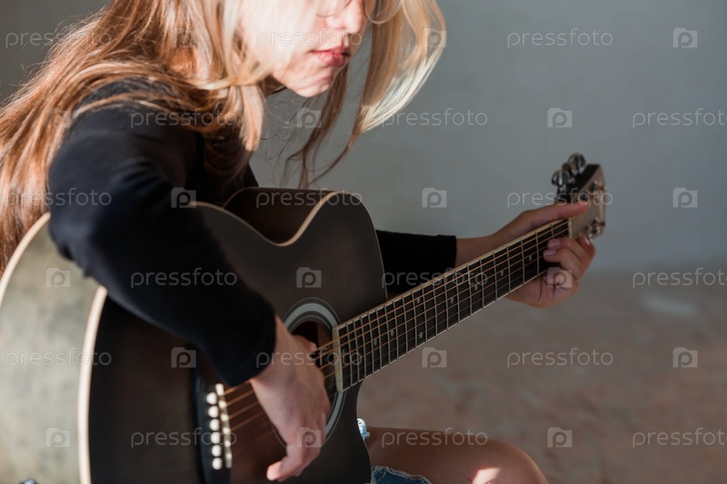 Музыка и хобби. Талантливая молодая девушка-музыкант сидит одна и сочиняет песни на гитаре. Девушка играет спокойную мелодию на музыкальном инструменте