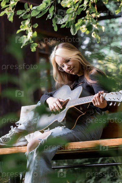 Музыка и хобби. Талантливая молодая девушка-музыкант сидит одна и сочиняет песни на гитаре. Девушка играет спокойную мелодию на музыкальном инструменте