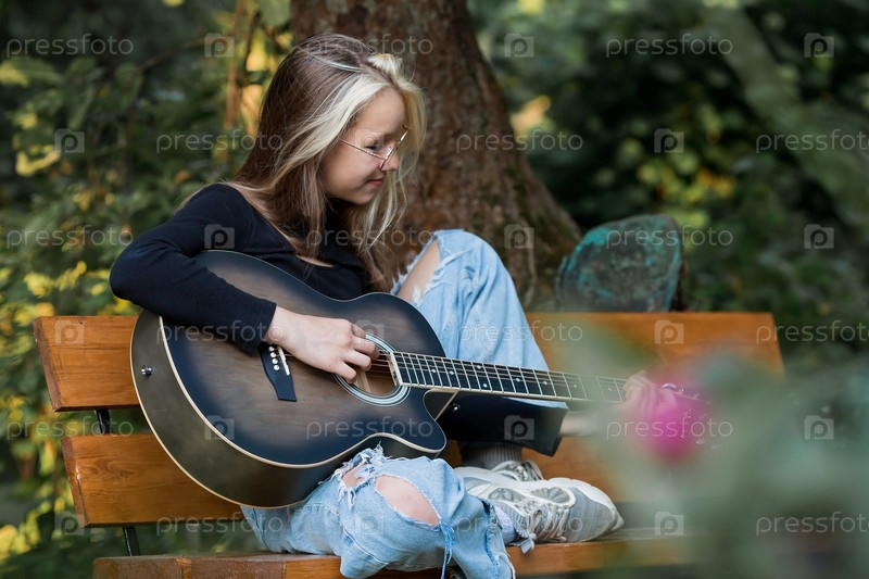 Музыка и хобби. Талантливая молодая девушка-музыкант сидит одна и сочиняет песни на гитаре. Девушка играет спокойную мелодию на музыкальном инструменте