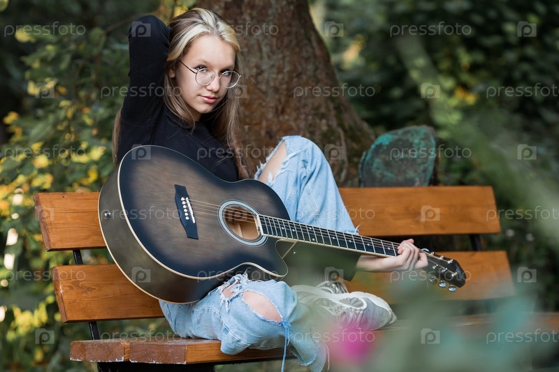 Музыка и хобби. Талантливая молодая девушка-музыкант сидит одна и сочиняет песни на гитаре. Девушка играет спокойную мелодию на музыкальном инструменте
