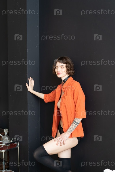 Молодая красивая женщина позирует в оранжевой рубашке в студии