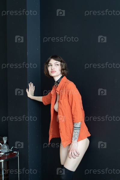 Молодая красивая женщина позирует в оранжевой рубашке в студии