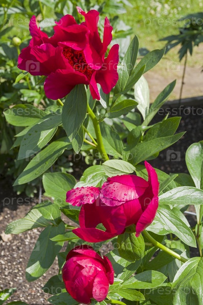 Цветение красно-марузового пиона сорта Постильон (Postillion) в Аптекарском саду (филиал ботанического сада МГУ).Москва