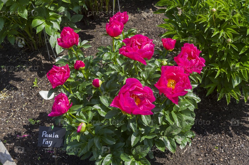 Цветение красно-розового пиона сорта Paula Fay в Аптекарском саду (филиал ботанического сада МГУ).Москва