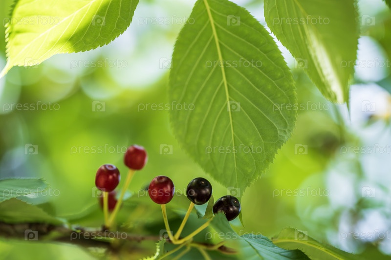 Ягоды вишни на ветке в летнем лесу